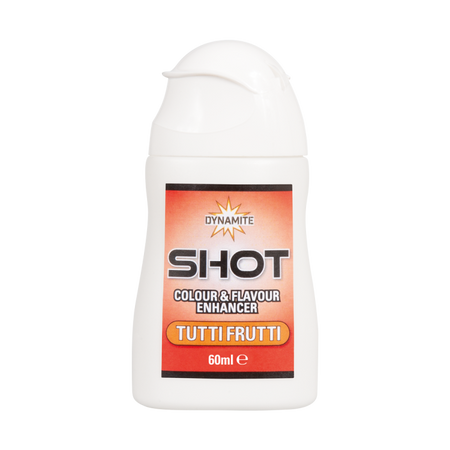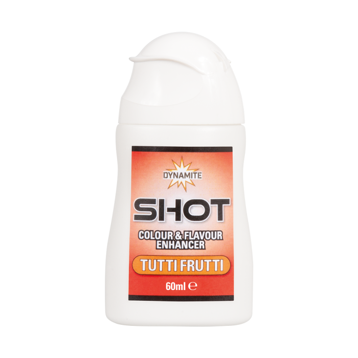 - Dynamite Shot Colour & Flavour Enhancers Designed as an easily applied concentrated liquid dye and flavour enhancer - ideal for pellets, meat, corn, groundbait, paste and a multitude of hookbaits. Particularly useful for customising fishery pellets to add colour and loads more attraction, making your bait stand-out from the crowd and increases your catch rate. Highly concentrated liquid colour & flavour enhancer High concentration makes a little go a long way Choice of F1 Sweet Yellow, Tutti Frutti Orange or Krill Red Easy to apply for instant colour & attraction Great addition to any feed baits, particularly pellets & meat Boost your hookbait, ideal for hook pellets, expanders, wafters etc Instant acting & long-lasting dye Extremely water-soluble attractants, drawing fish quickly in to your peg Supplied in a superb value 60ml bottle with a non-drip nozzle