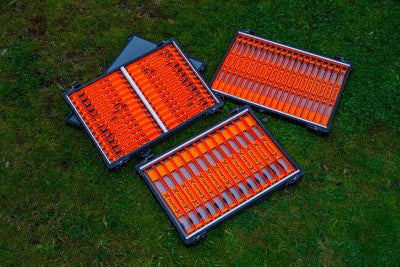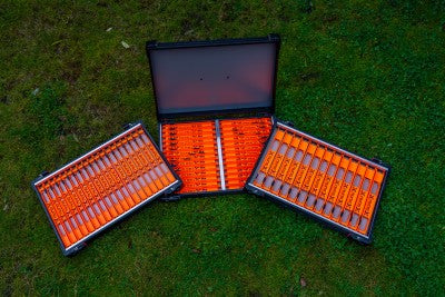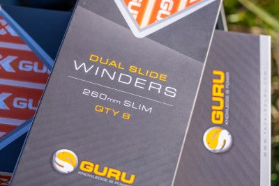 For the ‘pole’ end of the rig, there is an adjustable ‘slide’ hookup which can be used with loops or simply to trap the line if the depth hasn’t’ been decided. Again, featuring rounded plastic to hold a loop and is fully adjustable up the length of the winder to suit and store any length rig without the need of a pole anchor. They are finished off with minimalistic but super-strong center pieces in a slick Guru design, that makes the Winders easy to air/dry thanks to lots of ventilation points. There is a flat area so you can place a sticker or write on what components the rig features. Stickers for this are included and fit perfectly. The smart and bright orange Guru colour means you can easily see them when dropped too. Size wise, we have three options to cater for most needs – a 190mm Slim version, with 260mm Slim and Wide versions for anglers storing bigger bodied floats.