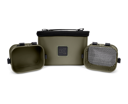 This EVA Bait Station provides fantastic storage for roving anglers. Comes with two internal trays, one of which features a 3mm mesh for riddling naturals and groundbaits. These can be clipped to the outside of the bag during use, giving a large workspace. Underneath the trays there is enough room for bait tubs and other baits. Comes with comfortable carry handles and a super tough zipper. 28 x 18 x 18 cm. Inner trays 15 x 12 x 7. 100% EVA.