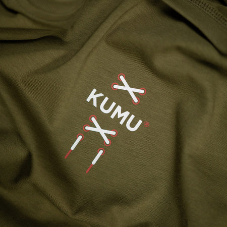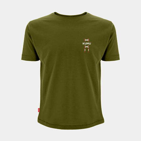 ed way. Detailed 6 colour screenprint on a super soft, 150gsm khaki green fabric with woven side tab detailing.