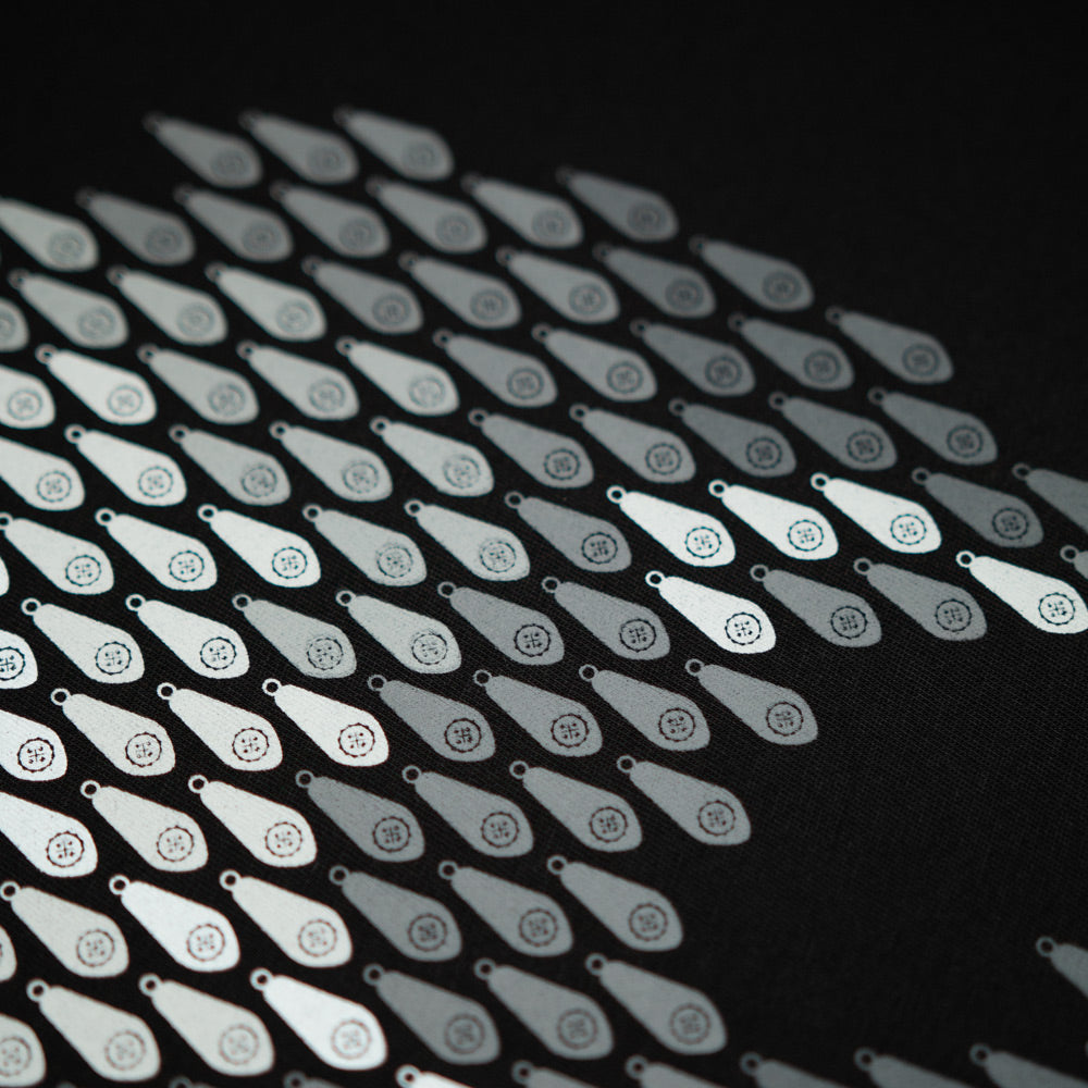 If you’ve been with us from the very inception of our brand, you may remember this gem from waaaaay back in 2019. We stumbled across an original sample recently, and felt it deserved a revival for 2025. Using a series of cool grey tones to create a 3D gradient effect skull constructed from fishing leads. 6 colour screenprint on our super soft 320g fabric with woven side tab detailing.