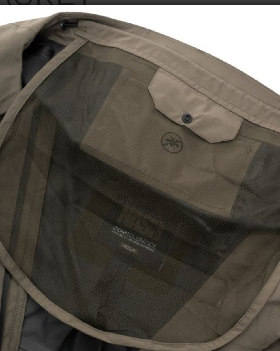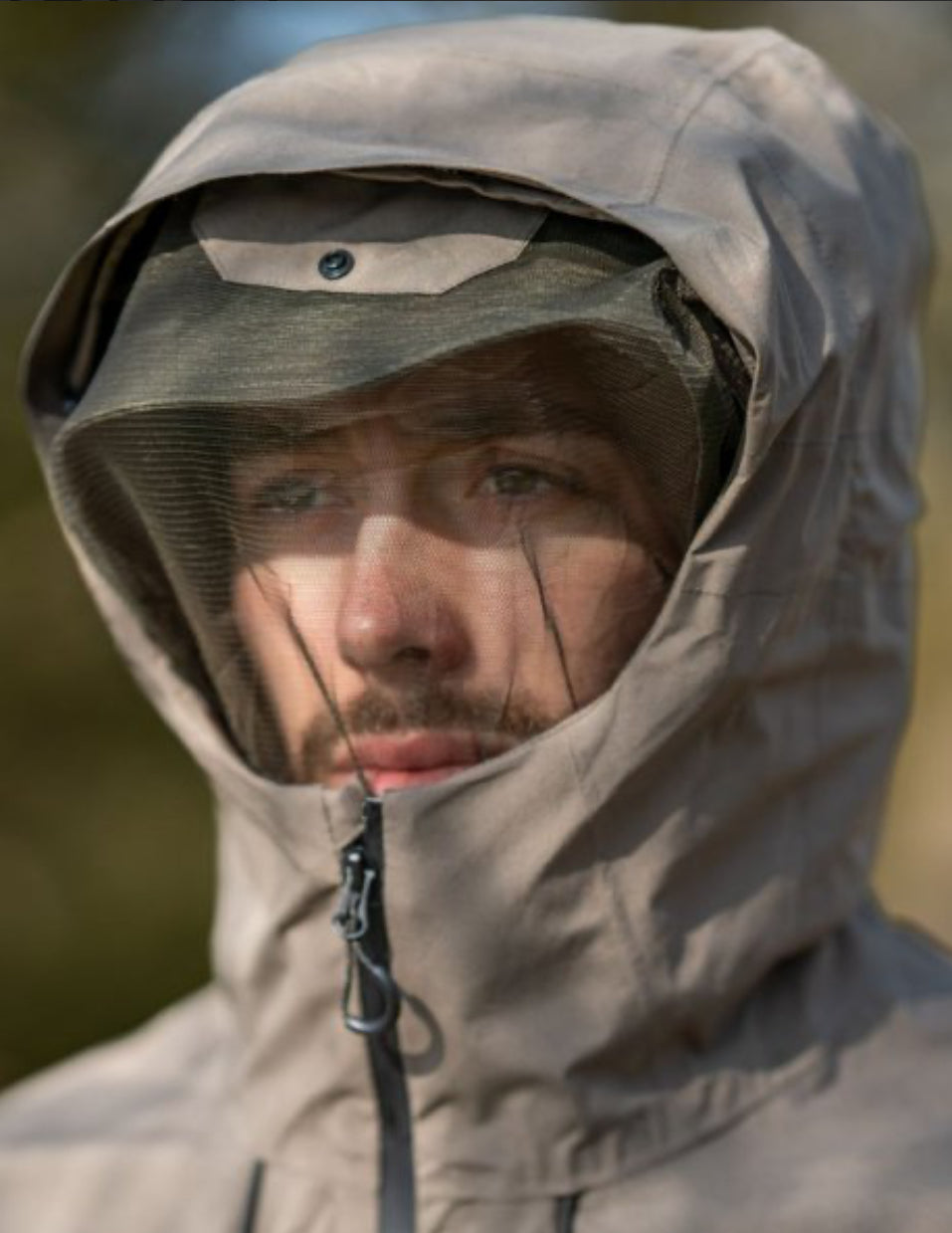 The jacket features an innovative, drop down mosquito face protection panel that stores inside the adjustable hood, with secure zipped hand pockets and Velcro cuff adjustment.